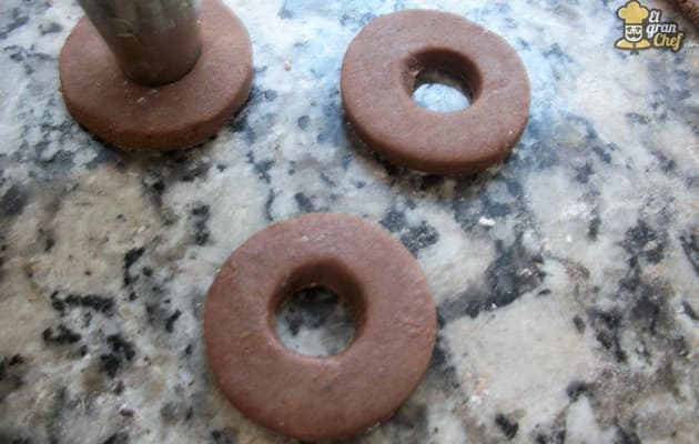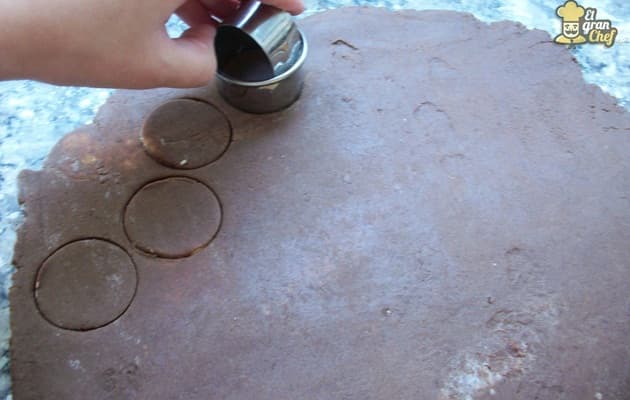 Con un palo de amasar y un cortante de 4 cm de diámetro realizamos este paso. Pero antes enharinamos la mesada para que la masa no se pegue.