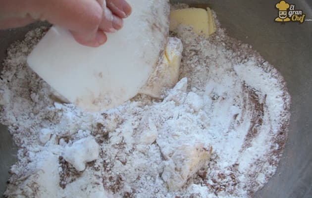 Agregamos mantequilla y con un cornet elaboramos un "arenado". Desgranamos la manteca para lograr incorporarla a los ingredientes secos.