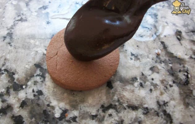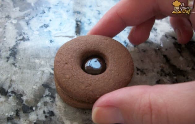 Colocamos una cucharadita en una de las tapas sin orificio. Luego, superponemos la otra tapita y presionamos apenas para que salga el relleno por el medio.
