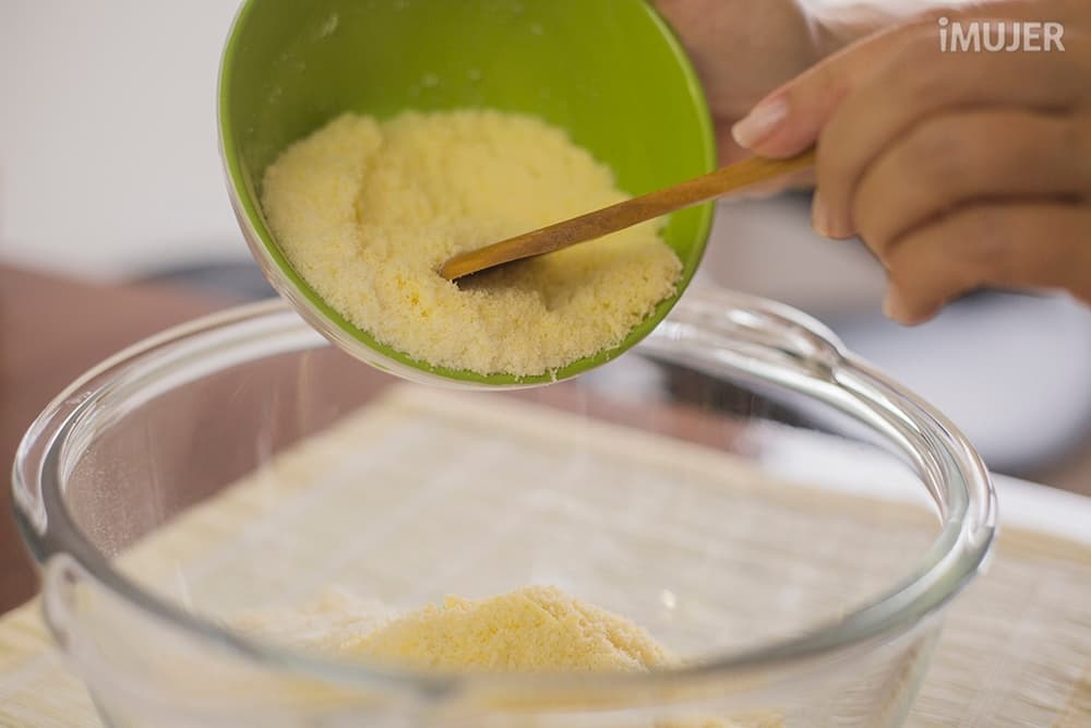 Mezcla en un recipiente la harina, el queso rallado y la fécula.