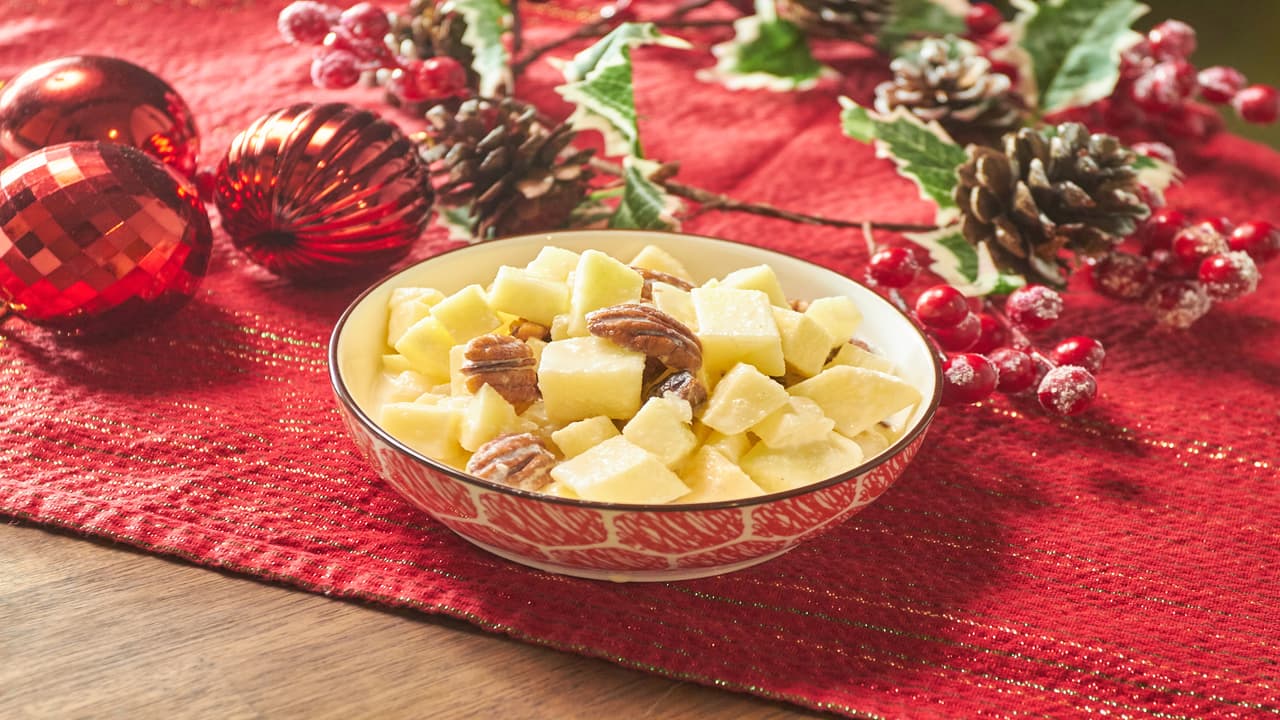 Esta ensalada (que parece más un postre) es indispensable en las mesas mexicanas durante la época decembrina. Está inspirada en la ensalada Waldorf, una receta creada en el hotel Waldorf Astoria de Nueva York, que los mexicanos adoparon e hicieron suya. Para darle un toque acidito que le de balance a los sabores, escoge manzanas verdes y añade piña fresca.