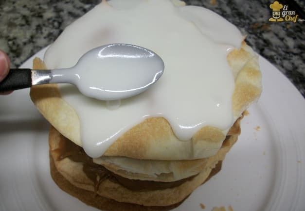 Paso 5: Volcamos el glasée por encima del mega alfajor de hojaldre y dulce de leche. Nos ayudamos con la panza de una cuchara para acomodar el glasée.