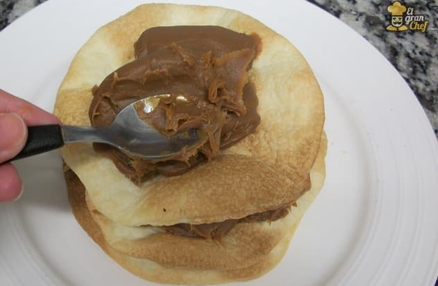 Esparcimos una importante cantidad de dulce de leche repostero con cuidado para no quebrar las tapas. Comenzamos colocando una base de masa y terminamos con una tapa de masa, repitiendo el proceso de relleno hasta utilizar los 6 discos.