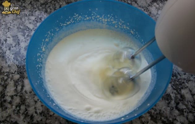 Mientras dejamos reposar el chocolate con crema caliente, continuamos con la receta, batiendo a medio punto el resto de la crema.