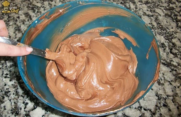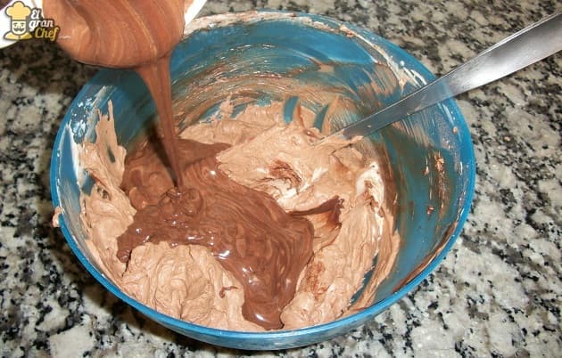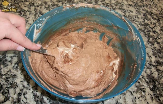 Finalmente, debemos integrar la preparación de crema con chocolate que dejamos reposando a la crema con azúcar impalpable y cacao. Para ello (para evitar que la mezcla pierda consistencia), agregamos a la taza con crema de chocolate un poco de la mezcla de crema con cacao y azúcar. Mezclamos y luego volcamos el contenido de la taza en el resto de la preparación.