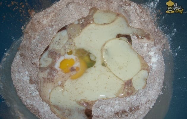 Una vez realizado este paso, en el bowl de los ingredientes secos hacemos un hueco en el centro y allí agregamos el huevo, la leche y el aceite; debemos mezclar hasta que se forme una preparación uniforme y homogénea.