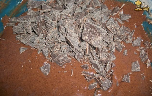 Cuando finalmente queda una mezcla pareja, agregamos chocolate picado en forma de chips y mezclamos hasta que queden distribuídos en toda la preparación.