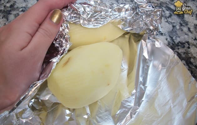 Envolvemos las papas en aluminio y las llevamos en una fuente al horno a temperatura media, hasta que pinchemos las papas y se sientan blandas (aprox 12 minutos).