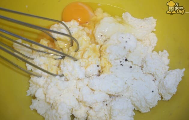 Por otro lado, en un bol, colocamos la ricota, la pimienta, la sal y los huevos.