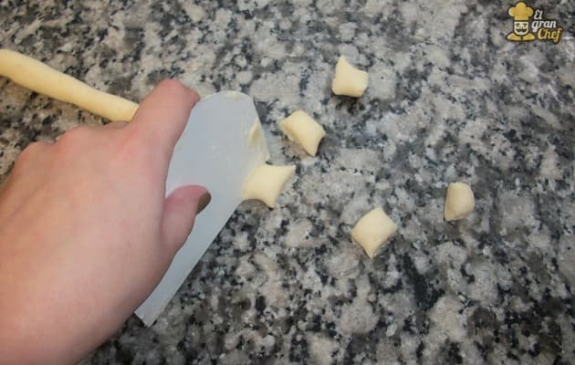 Luego, con un cuchillo o el lado plano de un cornet, cortamos piezas de 1 cm, como para obtener cuadraditos pequeños. Opcionalmente podemos rodarlos por un marcador de ñoquis o tenedor, para que tomen esa forma con el relieve característico de esta pasta.