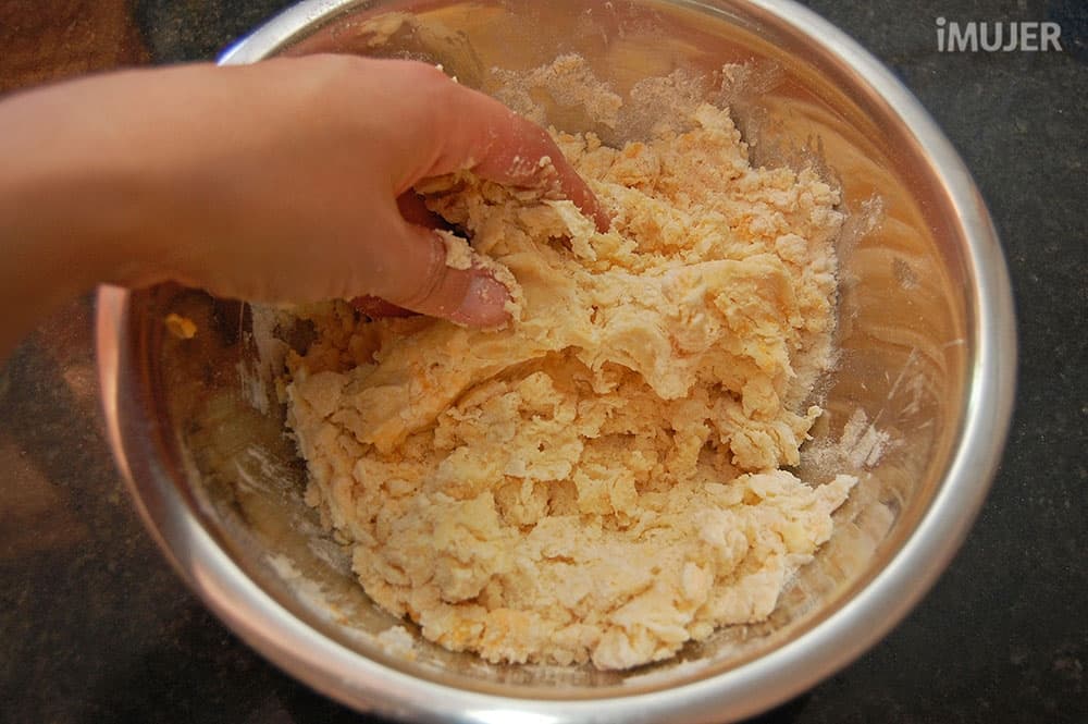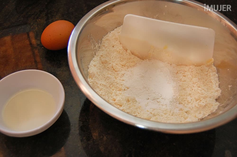 Coloca los ingredientes secos en un bowl dejando un hueco en el centro para agregar la mantequilla fría cortada en cubitos, con la ayuda de un tenedor o tus manos combina harina y mantequilla hasta lograr un arenado.