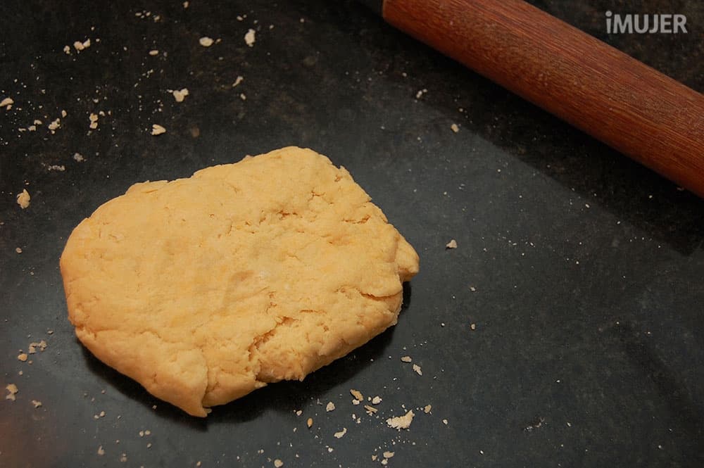Añade la leche y el huevo y une hasta formar una masa, amasa un poco sobre la mesada enharinada y estira en forma rectangular.