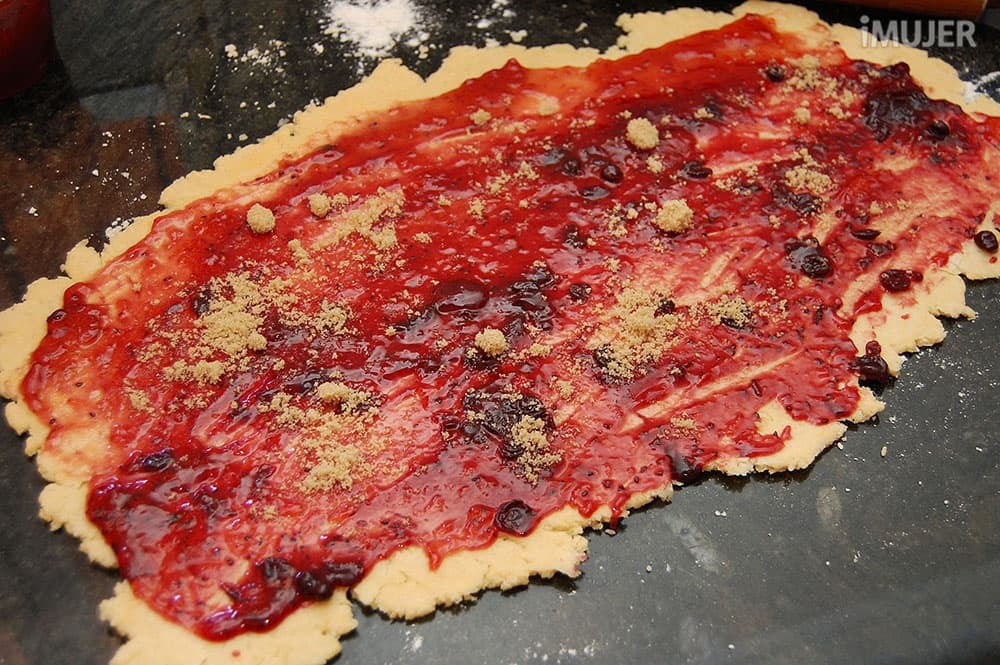 Unta con la mermelada de frutos rojos y espolvorea con el azúcar y las nueces picadas.