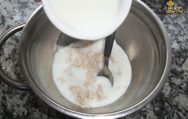 Entonces, empezamos partiendo el cubito de levadura de cerveza fresca en un bol. Agregamos 1 de las tazas de leche mencionadas en la receta. Es importante que la leche esté tibia para ayudar a la fermentación de la levadura.