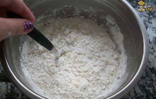 Añadimos 3 cucharadas de la harina a esta preparación y seguimos mezclando hasta que se haga una pequeña masa.
