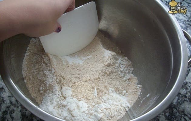 En otro bol, preparamos los demas ingredientes. Mezclamos las harinas y la sal.