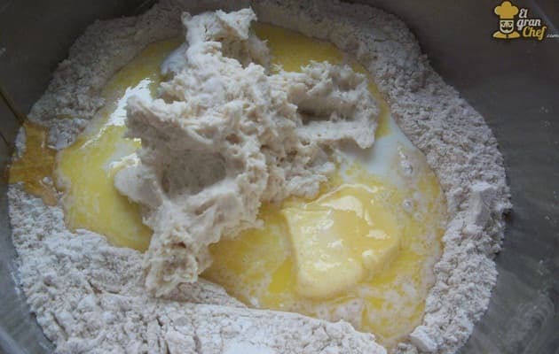 En el centro, colocamos la masa de levadura ya fermentada y esponjosa y también la miel y la mantequilla blanda, casi derretida. Añadimos la otra taza de leche y continuamos uniendo.