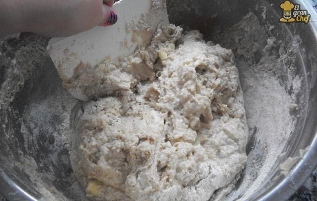 Una vez agregados, seguimos mezclando hasta obtener una masa lisa, suave y blanda. Si se nos pega mucho a las manos, incorporamos un poco de harina.