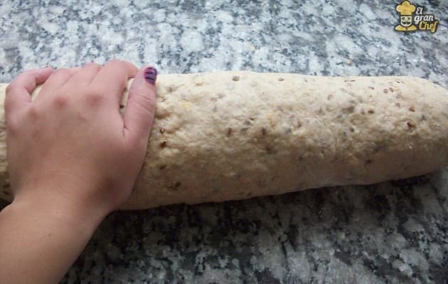 Ahora formamos un rollo y lo partimos a la mitad. De esta masa, obtendremos dos panes de molde (realizados en molde clásico de pan lactal o de budín).