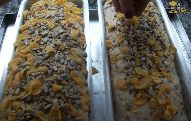 Espolvoreamos la superficie con abundantes semillas y copos de cereal para darle una terminación más vistosa y tentadora y para que, además, identifiquemos nuestro pan, sabiendo qué tiene en su interior.