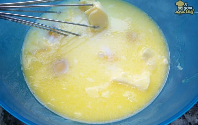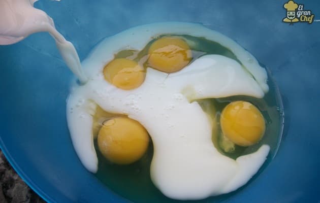 En otro bol, batimos ligeramente la leche tibia restante, con el agua y los huevos.