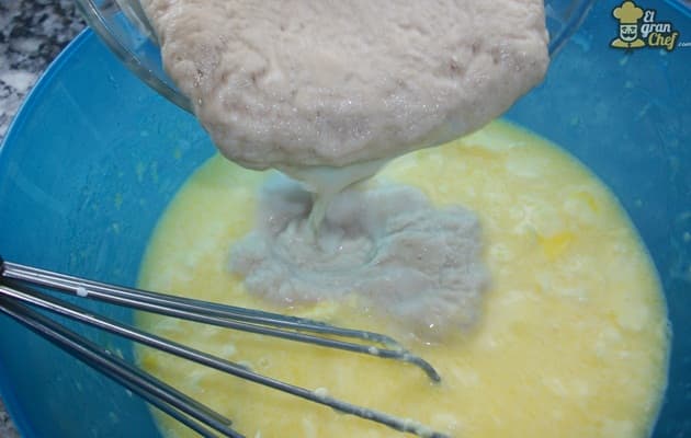 Añadimos la mezcla de levadura al resto de la preparación y batimos suavemente.