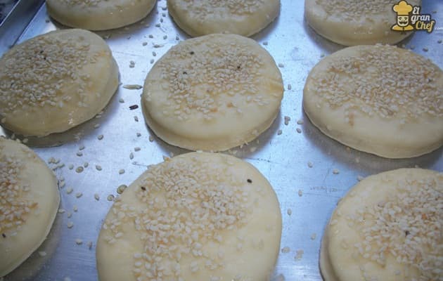 Agregamos las semillas de sésamo y llevamos al horno a 220°C hasta que los panes se vean dorados.