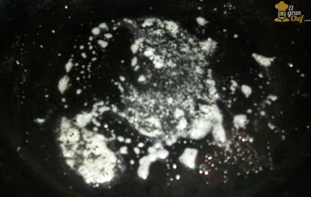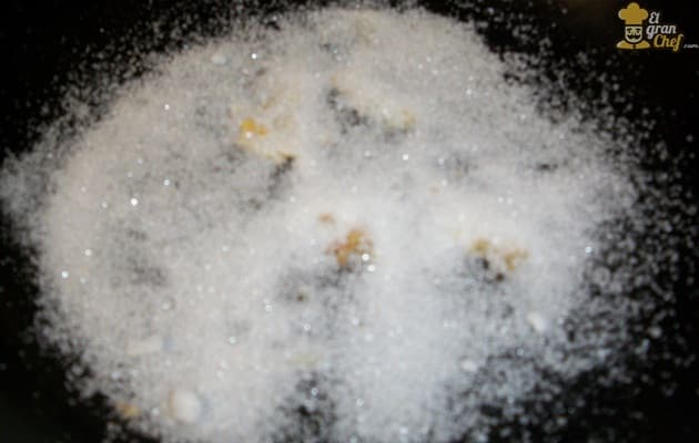 El caramelo lo logramos fundiendo azúcar en una sartén, sin remover y esparcida por toda la superficie.