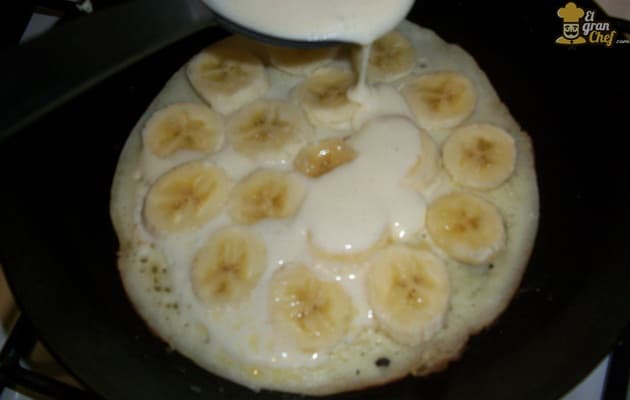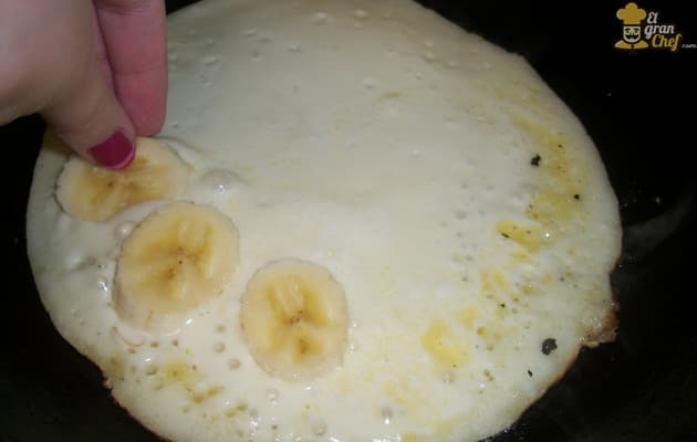 Cuando vemos que el panqueque comienza a cocinarse en los bordes y vemos algunas burbujas, aprovechamos para acomodar las rodajas de banana rápidamente.
