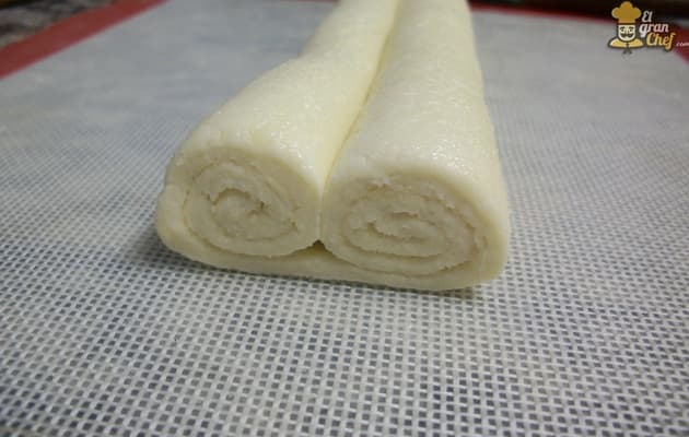 Colocar harina sobre la mesa como para que no se pegue la masa de tarta al apoyarla. Un niño deberá enrollarla hacia un lado y el otro niño hacia el otro hasta que se encuentren en el medio y quede como en la foto: