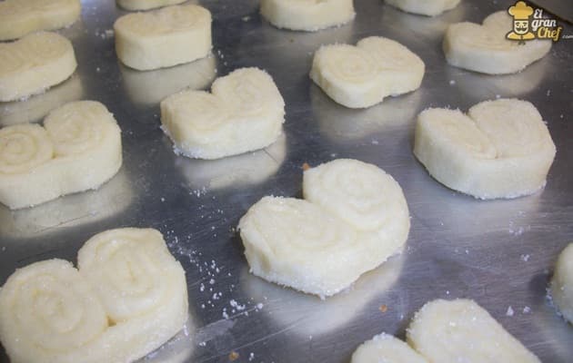 Con cuidado y sin que se deformen, cortar las palmerita con un cuchillo y colocarlas en la fuente enmantecada. Llevar al horno moderado y cocinar 5 ó 10 minutos.