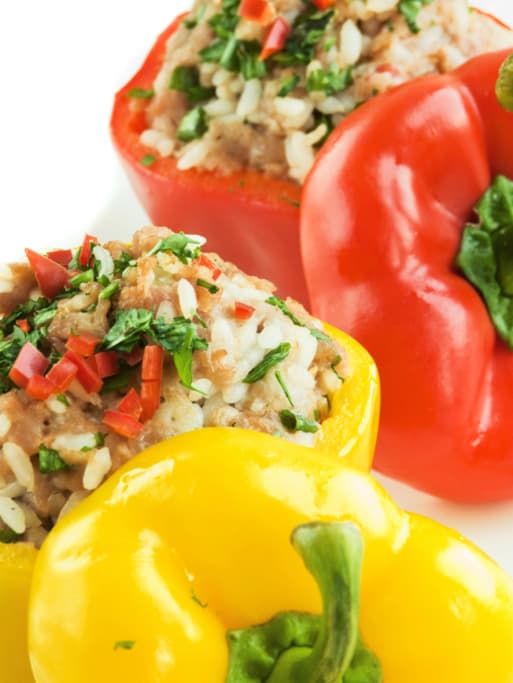 Corta la parte superior de los pimientos. Retira las venas y las semillas. Coloca el risotto dentro de los pimientos. Colócalos en una bandeja para hornear y agrega el caldo de pollo caliente.