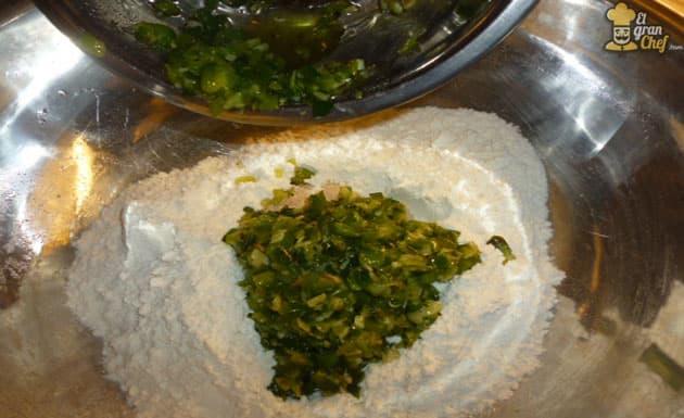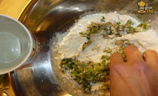 Agregamos el agua y el aceite de a poco. Amasamos hasta que la masa no se nos pegue en las manos.