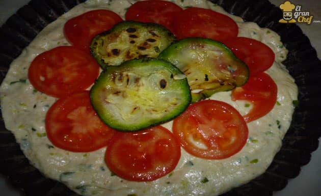 Una vez que ya leudaron, colocamos en una fuente para horno y le agregamos: el zapallito cortado en rodajas y grillado previemente y el tomate cortado en rodajas. Los colocamos sobre la pizza.
