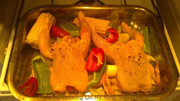 Coloca sobre ella el pollo y las verduras sazonadas. Cubre con papel de aluminio y hornea durante 45 minutos. Quita el papel y gratina unos minutos.