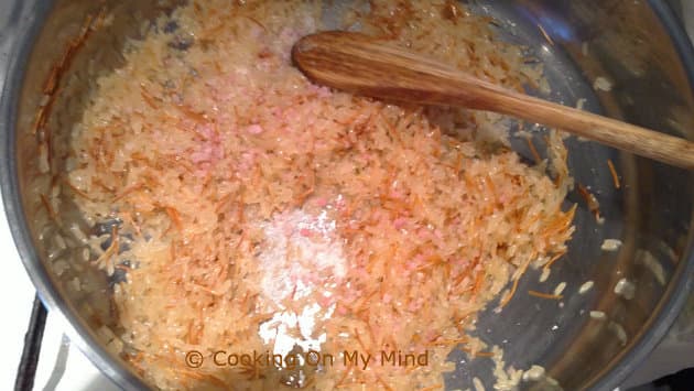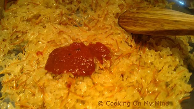 Mientras se cocina el pollo, prepara el arroz. Tuesta los fideos en aceite y luego, coloca el arroz. Agrega una cucharada de pulpa de ñoras, sal y pimienta.