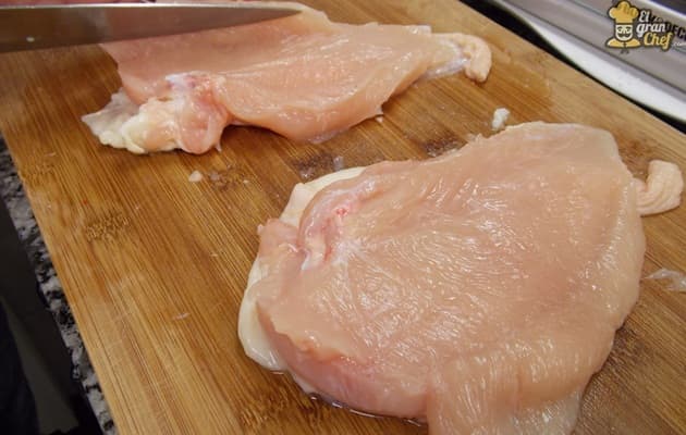 Para arrollar las pechugas es necesario abrirlas para que queden más grandes. Para ello, hacer un corte desde un lado sin llegar al otro para que no se separen y queden como si fueran las hojas de un libro. De esta manera quedará más fina y grande.