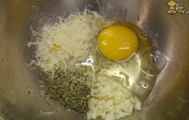 Realizar un ligue mezclando el huevo, queso rallado, orégano y ajo. Esto debe quedar como una pasta espesa.