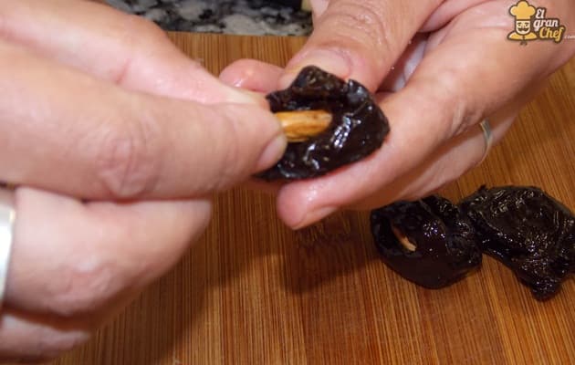 Tomar las ciruelas y rellenarlas con una o dos almendras.