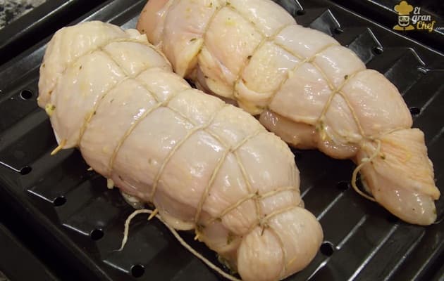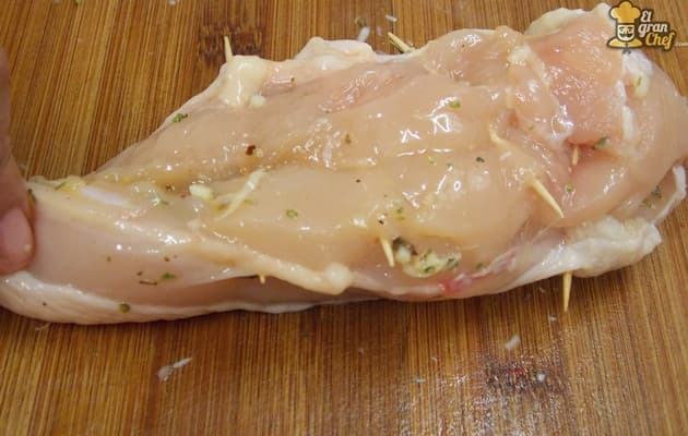 Arrollar las pechugas y cerrarlas con la ayuda de palillos a lo largo de la misma.