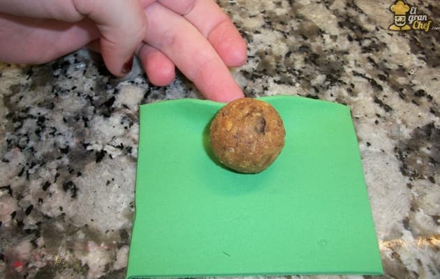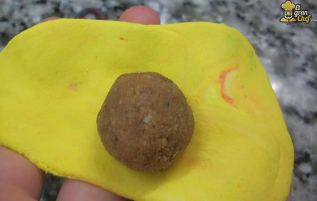Comenzamos a rodar la pelotita de trufa, mientras se va envolviendo de la masa.