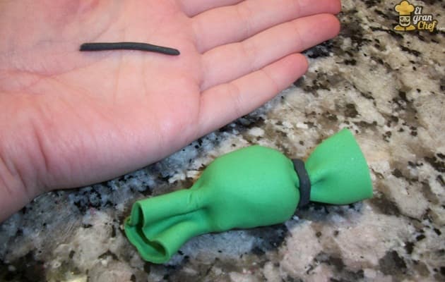 Después cortamos tiritas de masa negra y las ubicamos en la zona del pliegue para que parezca el papel del caramelo.