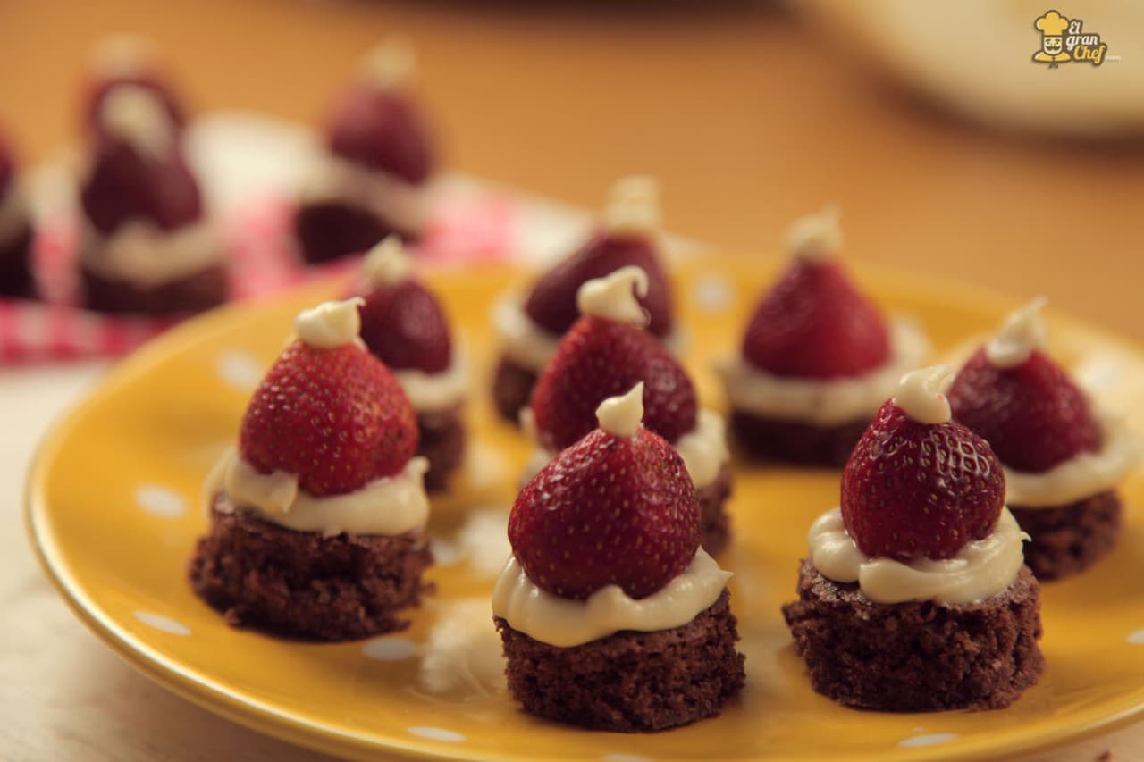 Se trata de unos bocaditos de brownie, fresas y queso crema que se parecen al sombrero de Papá Noel. ¿No te parecen adorables? Además, ¡son deliciosos! Te recomiendo que hagas unos cuantos porque es imposible comer uno solo.