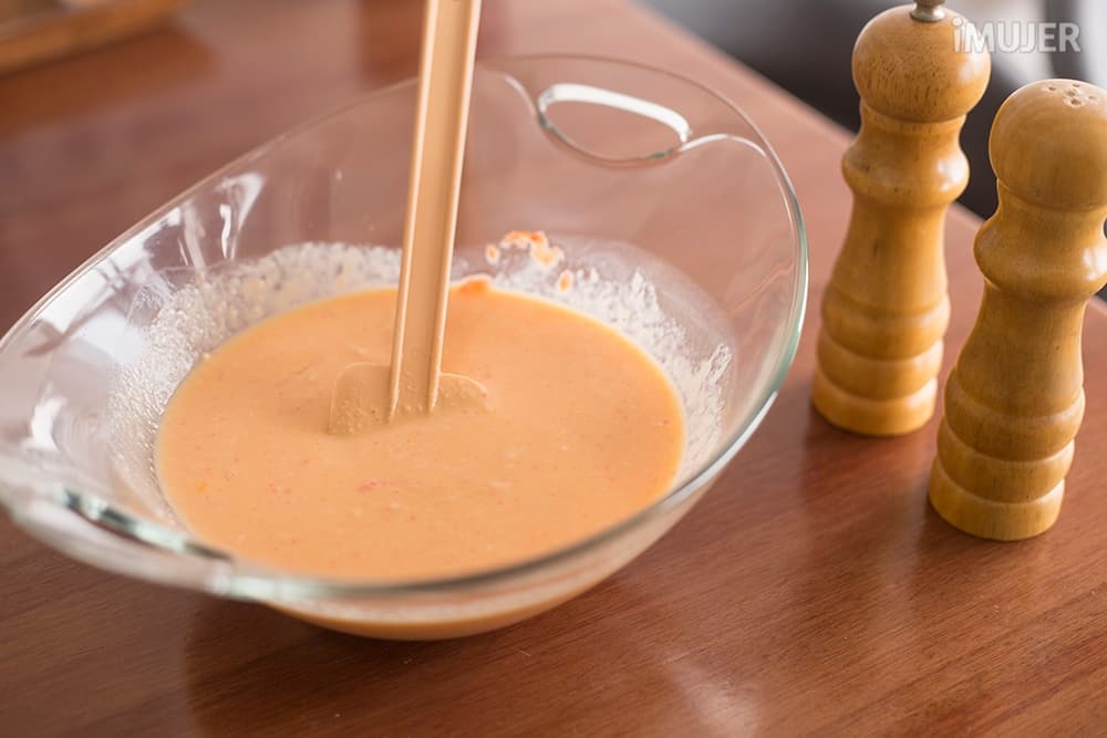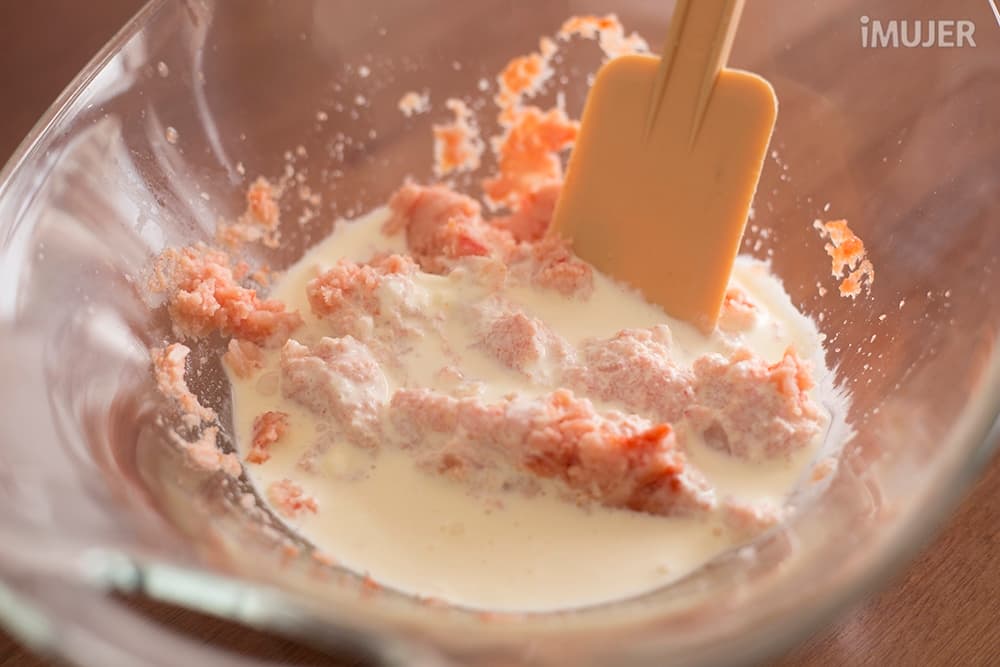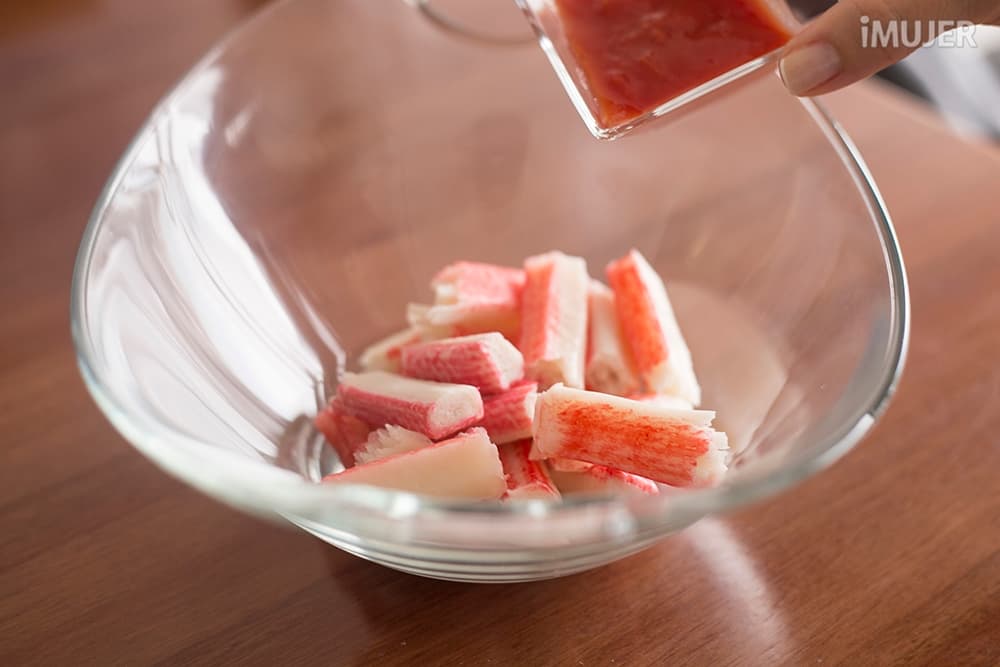 Corta al medio los palitos de cangrejo y colócalos en un bol. Añade la salsa de tomate y procesa con un mixer.