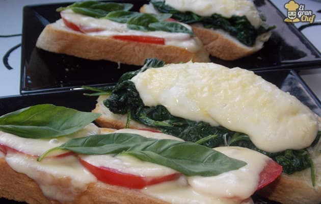 Solo necesitas 6 ingredientes para preparar estas bruschettas de tomate caprese y espinaca, ¡y uno de ellos puede ser pan del día anterior!