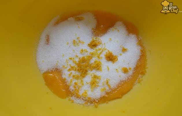 En un bol aparte, coloca las yemas junto con el azúcar y la ralladura de limón. Comienza a batir hasta lograr el punto letra -que es cuando las yemas se tornan más blancas, y con el batidor podemos hacer formas sin que se borren instantaneamente-.