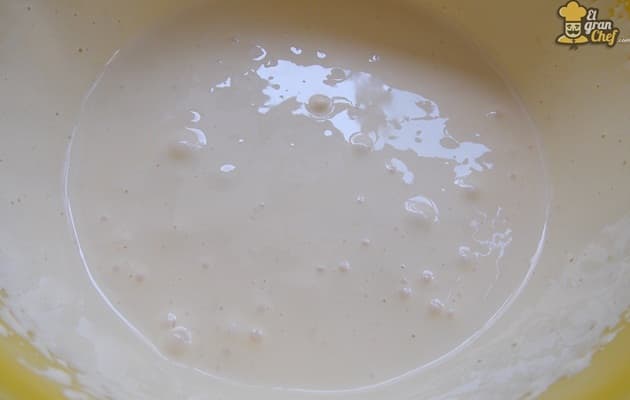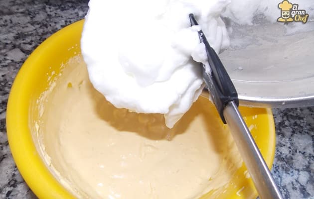 Por último, incorpora las claras batidas que habíamos reservado anteriormente. Con movimientos envolventes une las claras a las yemas, dejando una preparación uniforme.