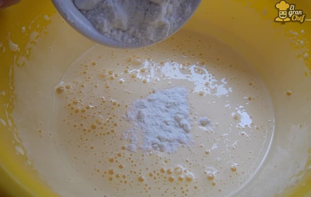 Incorpora la harina a las yemas batidas y mezclar con movimientos envolventes para no bajar la espuma de la preparación.