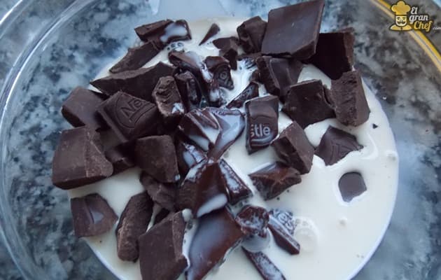 Para el relleno y la cubierta utilizaremos la misma crema. Pone a calentar en microondas la mitad de la cantidad de la nata. Pica el chocolate amargo y colocarlo en un bol. Agregar la nata que estaba en el microondas y dejar reposar unos 5' hasta que el chocolate se funda.