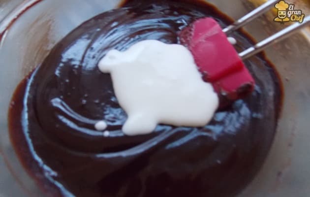 Al chocolate fundido, agrega una cucharada de la crema batida junto con el azúcar para equiparar densidades y que luego la crema no se corte.